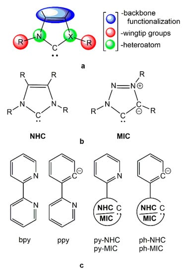 (a) Structural modifications to control the electronic/steric properties of carbenes; (b) general structure of N-heterocyclic carbene NHC and mesoionic carbene MIC groups used in Ru-photoredox systems; and (c) typical bidentate ligand frames based on pyridine, phenyl, and carbenes.