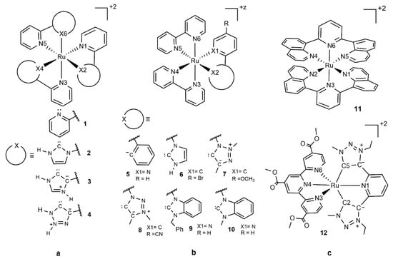 Homoleptic (a and 11) and heteroleptic (b and 12) pyridine– and carbene–ruthenium complexes based on bidentate (a and b) and tridentate (c) ligands investigated in this study; 1: [Ru(bpy)3]2+, 2: [Ru(py-NHC)3]2+, 3: [Ru(py-aNHC)3]2+, 4: [Ru(py-MIC)3]2+, 5: [Ru(bpy)2(ppy)]1+, 6: [Ru(bpy)2(phBr-NHC)]1+, 7: [Ru(bpy)2(phOMe-MICMe)]1+, 8: [Ru(bpy)2(phCN-MICMe]1+ 9: [Ru(bpy)2(py-fNHCCH2Ph)]2+, 10: [Ru(bpy)2(py-fNHCMe)]2+, 11: [Ru(dqp)2]2+ 1 and 2: [Ru(tpy)(C^N^C)]2+.