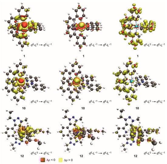 Electron density difference distributions, ∆ρ(r), corresponding to the S0 → T1 transition (left, inducing a formal d6L0 → d5L−1 electronic structure change) the first excited-state reduction step of the reductive quenching cycle (middle, T1 → Dred transition, inducing a formal d5L–1 → d6L−1 electronic structure change) and second ground-state oxidation step of the reductive quenching cycle (right, Dred → S0 transition, inducing a formal d6L−1 → d6L0 electronic structure change) for 1, 10, and 12. Note that the ∆ρ(r) map of the latter process is given for the reduction direction (S0 → Dred) for the sake of consistency.