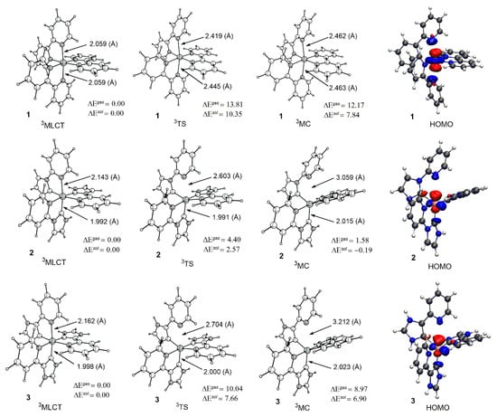 Beyond the above described photophysics and redox properties, another critical property of efficient photoredox catalysts is the long lifetime (~μs) of the 3MLCT state of these complexes, which allows these species to engage in intermolecular collisions and reactions in the excited state []. Both radiative and non-radiative processes contribute to the decay of the 3MLCT state, and these processes, together with the lifetime, depend significantly on other external factors, for example, on the solvent [,,]. It has been demonstrated, for instance, that 80% of triplet MLCT excited-state *[Ru(bpy)3]2+ returns to the ground state through the 3MC state following a very efficient non-radiative pathway []. Accordingly, if the transition from the 3MLCT to the 3MC state is fast (i.e., a small activation barrier separates these states), the overall deactivation proceeds at high rates [,,,]. In regard to the 3MLCT to 3MC transition, one has to realize that the t2g d orbital set cannot host another α electron in the 3MC state and one of the eg* d orbital, typically the dz2, is necessarily populated by an electron in this state. The formally metal-based dz2 is anti-bonding along the axial M–L interactions in an octahedral field, and its population results in a repulsion along the M–L bond and, concomitantly, to a characteristic elongation of the axial bonds []. Accordingly, the geometry around the metal is quite different in the 3MC and 3MLCT states which means, from a computational viewpoint, that these two triplet states appear as well-defined local minima on the triplet PES and the corresponding connecting transition state also has acute features that characterize the elongation of the axial bonds [,]. These notions can be clearly recognized in Figure 5 showing the structure of 3MLCT, 3TS, and 3MC states of homoleptic systems 1, 2, and 3, calculated at the PBE/Def2-TZVP(−f) level of theory, given together with their gas phase and solution-state (in acetonitrile) relative energies to 3MLCT.