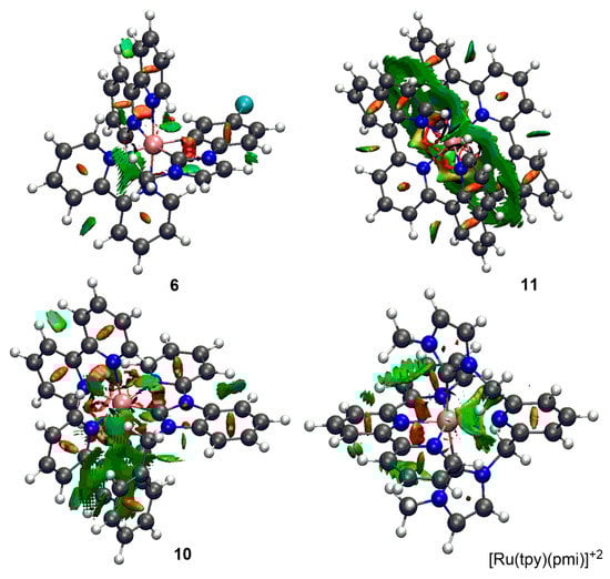 NCI isosurfaces (s = 0.4 a.u.) of complexes 6, 10, 11, and [Ru(tpy)(pmi)]2+ in their respective S0 state. Color coding of NCI surfaces: blue—attraction, green—van der Waals interaction (very weak attraction); and red—repulsion. The pmi ligand is 1,1′-[2,6-pyridinediylbis(methylene)]bis[3-methylimidazolium] in [Ru(tpy)(pmi)]2+.