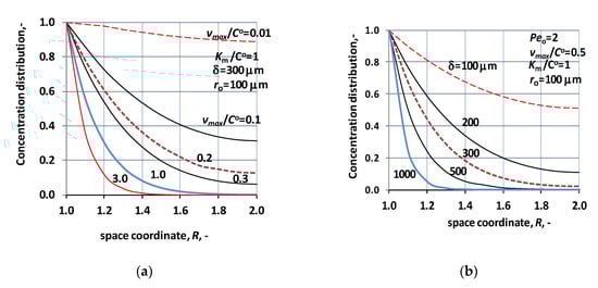 Normalized concentration distribution across the biocatalytic membrane layer, in case of mass transport without sweeping phase. (a) The parameter is the relative value of the maximal reaction rate, i.e., vmax/CO (Peo = 2; D = 1.9 × 10−9 m2/s; ro = 100 μm; δ = 300 μm; KM/CO = 1); (b) concentration distribution at different values of the thickness of the biocatalytic membrane layer (Peo = 2; D = 1.9 × 10−9 m2/s; ro = 100 μm; KM/CO = 1).