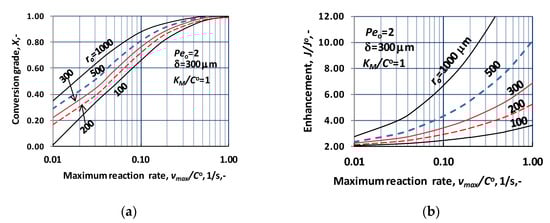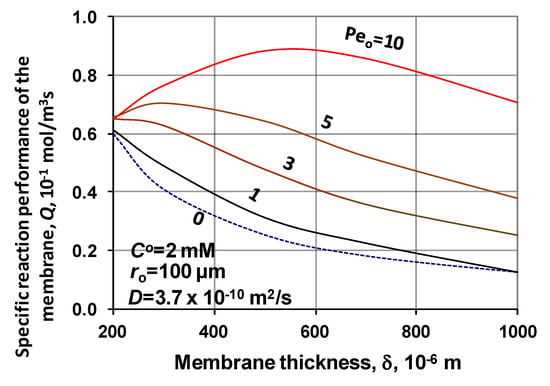 Figure 4b illustrates the change of the conversion grade as a function of vmsx/CO, at different values of the catalytic membrane thickness (ro = 100 μm; Peo = 2; KM/CO = 1). With the increase of the biocatalytic reactor volume, i.e., with increase of the catalytic membrane thickness, the conversion grade, as it expected, essentially increases. The conversion value quickly, in narrow reaction rate regime, increases up to unity, at a given value of reactor thickness. The reaction rate necessary to reach the complete conversion lowers significantly with increase of the reactor thickness. Generally, it can be stated that the reactor thickness should carefully be chosen, taking into account the reaction rate. On the other hand, the negative effect of the mass transport resistance should also be taken into account, when one wants to choose the correct biocatalytic membrane thickness.