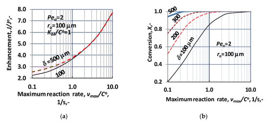 The values of enhancement increase with similar tendency, as plotted in Figure 3b. Values of enhancement are in harmony with data of Figure 3b, at ro = 100 μm and δ = 300 μm (values corresponding to these parameters should be located between the two curves shown in Figure 4a). On the other hand, perhaps a little bit surprising, that value of the enhancement depends on the thickness of the biocatalytic membrane reactor in small measure, only. Figure 4a shows effect at two reactor thicknesses, at δ = 100 μm and δ = 500 μm. Their values tend to the same values with increasing reaction rate, independently of the biocatalytic membrane thickness. This behavior is the consequence of the lower and lower reactant concentration as the reaction rate increases. Due to it, the membrane reactor takes part in the reaction in lesser and lesser portion, eliminating the role of the reactor thickness. As can be seen, the thickness can influence the value of enhancement at low reaction rate (vmax/CO), only, in that reaction rate regime, where reactant exists in the whole layer of the reactor. This effect is shown in reaction rate regime between 0.1 and 1.0, which is at border of intermediate and fast reaction rate regime.