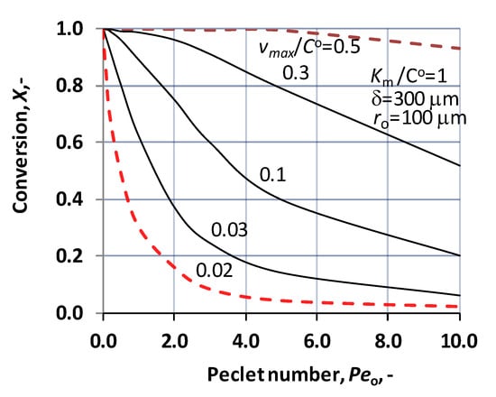 Change of conversion as a function of the inlet Peo-number, at different values of vmax/CO, under operating mode without sweeping phase, i.e., dC/dR = 0 at R = Rm, applying the Michaelis–Menten kinetics (N = 1000; δ = 300 μm ro = 100 μm; KM/CO = 1; D = 1.9 × 10−9 m2/s).