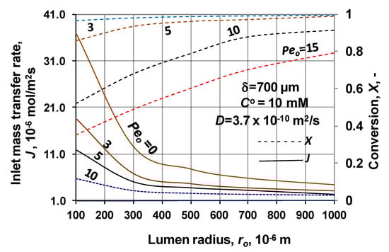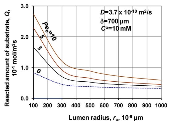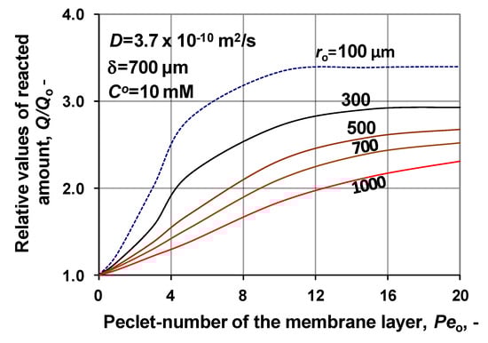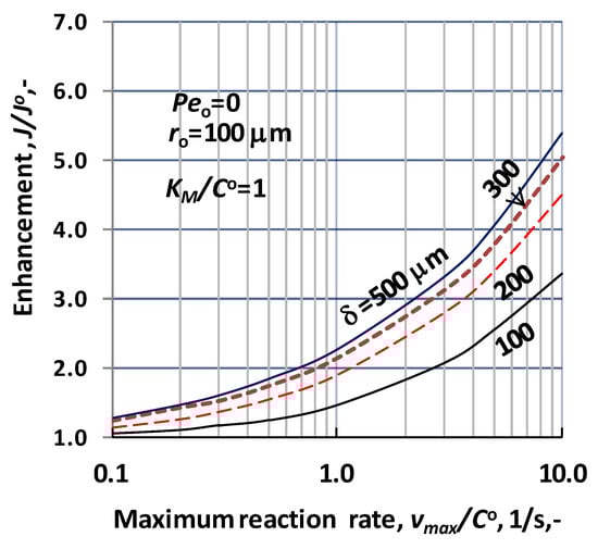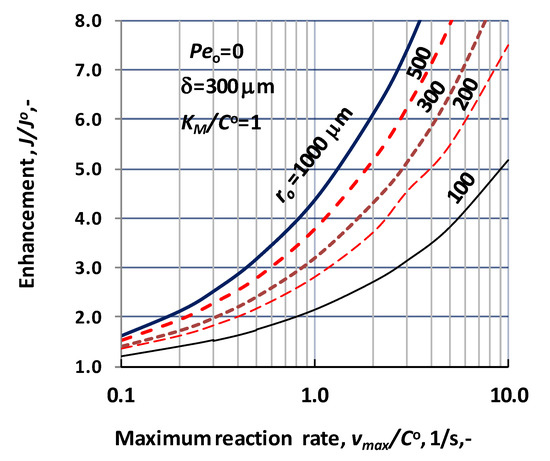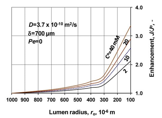 The effect of the biochemical reaction rate, at different values of the lumen radius, is illustrated in Figure 7, at δ = 300 μm; KM/CO = 1; D = 1.9 × 10−9 m2/s, Peo = 0. The predicted values were obtained without convective velocity across the catalytic membrane layer. The significant increase of the normalized reaction rate is the consequence of effect of biochemical reaction rate, at a given value of the lumen radius. Let us look at the value of the reaction modulus at, e.g., ro = 100 μm and vmax/CO = 10. For that case the reaction modulus, , is equal to 10 (). Enhancement should be identical with the value of the reaction modulus at this reaction modulus. The actual value of enhancement in Figure 7 is close to 5, which indicates that the specific physical mass transfer rate is much higher at this lumen radius and it reduces the effect of the reaction rate on the mass transfer rates. On the other hand, the thickness also strongly affects the enhancement at a given lumen radius. This is the consequence of the increasing reaction volume and the fact that the physical specific mass transfer rate also decreases with the increase of the delta (see Equation (30)).