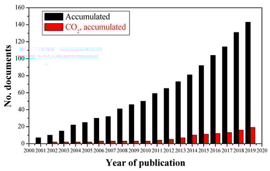 The distribution of annual publications and the evolution of the number of accumulated documents are depicted in Figure 2. The total number of articles found for the keywords in Figure 2, was 143, of which 19 corresponded to CO2 reduction.