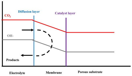 Regardless of the cell configuration selected, a relevance concern appears when employing GDE: material losses and degradation. Coating a thin film of conductive material over the electrode allows controlling catalyst deactivation and provides new pathways for CO2 and products transport, altering the diffusion barrier and modulating pH and access to active sites of the catalyst buried in a solid oxide matrix. [46]. The membrane layer applied as coating must meet some requirements: high conductivity to minimize ohmic losses and high ion exchange capacity to supply the OH− and maintain the alkaline media, which are related to its hydrophilicity, and of course, it must be selective to CO2. The stages of the alkaline anion-exchange membrane-coated electrode’s transport and catalytic limitations are schematized in Figure 6.
