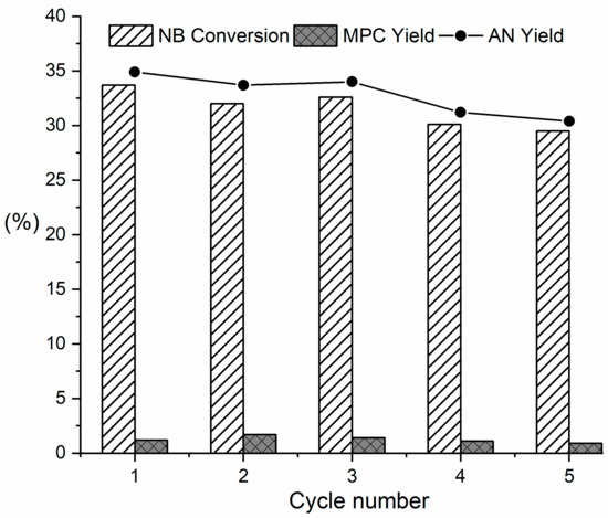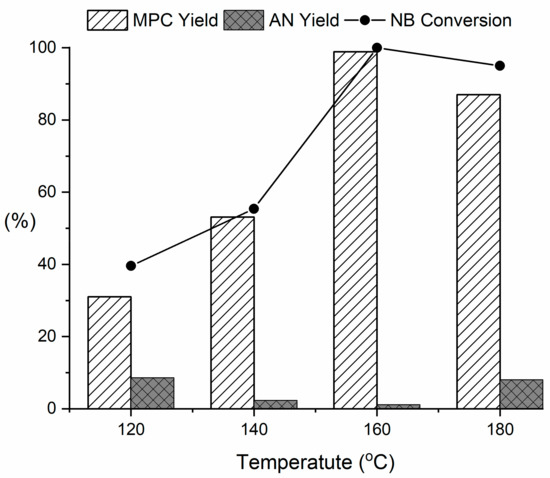 The influence of the reaction temperature on the reductive carbonylation of NB over FeSe2/γ-Al2O3 was tested with a variable thermal scale from 120–180 °C. As shown in Figure 4, the higher MPC yield was obtained when elevating the temperature until 160 °C, thereafter both conversion and yield are decreased. The generation of AN could not be neglected at a low temperature of 120 °C, which is ascribed to a simple reduction of NB to AN. However, AN reduces with a further increase in the temperature up to 160 °C. The lower yield of MPC, together with the increase in the aniline (AN) formation at 180 °C might be due to the thermal decomposition of MPC.
