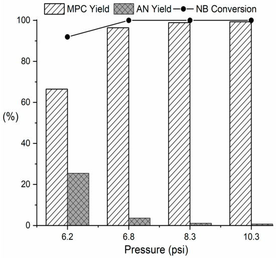 The influence of CO pressure was also studied by elevating pressure from 6.2 to 10.3 MPa at 160 °C for 4 h. As shown in Figure 5, the results reveal that the pressure effect is not as strong as the reaction temperature; however, at least 6.8 MPa of CO is needed to achieve an acceptable MPC yield. It is worth mentioning that the AN formation is suppressed with the increase in the pressure, suggesting that the high pressure of CO is beneficial for the generation of selenium-carbonyl species which might act as an intermediate.