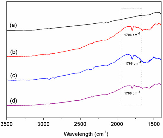 To determine the active species of the reductive carbonylation, FeSe2 was reacted with CO (8.3 MPa) in the presence of methanol at 160 °C for 4 h. The resulting solids were collected and dried under vacuum, and then pelletized with KBr. The sample was analyzed by FT-IR spectroscopy, but no carbonyl band of FeSe2 was observed (Scheme 2, Figure 8a). On the other hand, when the same process was carried out in the presence of O2 with CO, i.e., CO/O2 mixture (v/v = 80:20) (Scheme 3), FT-IR spectra of this sample exhibits a carbonyl peak at 1796 cm−1 (Figure 8b).