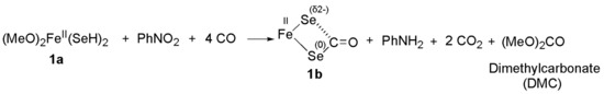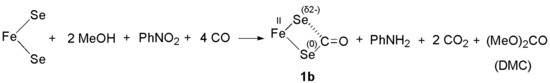 Scheme 7 provides a plausible mechanism of the reductive carbonylation of nitroarene catalyzed by FeSe2. The first step of the carbonylation would be the reaction of FeSe2 with methanol to form (1a) (Scheme 4), then the generation of active catalyst, FeSe2(μ-CO) (1b) via the reaction between 1a and CO in the presence of NB. Once again, it is worth emphasizing that 1b is not able to generate by the direct reaction between FeSe2 and carbon monoxide (Scheme 2) without the presence of an oxidant like oxygen or NB, as studied using FT-IR analysis (Figure 8). The combination of Scheme 4 and Scheme 5 generates Scheme 6, indicating that the formation of FeSe2(μ-CO) (1b) can be assisted by the conditions of the reductive carbonylation of NB.