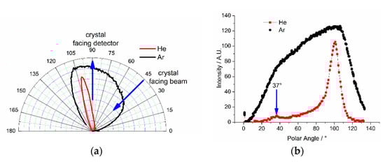 In contrast to the simulated scattering, the experimental result for Argon shows no separated peaks, and is due to the fact that Ar scattering is not elastic due to its higher accommodation and a much higher enthalpy of physisorption (~1–2 kJ/mol for He and about 10× that figure for Ar [35]). A more detailed discussion of these data and fitting of the Ar data is given in the Supplementary Materials.