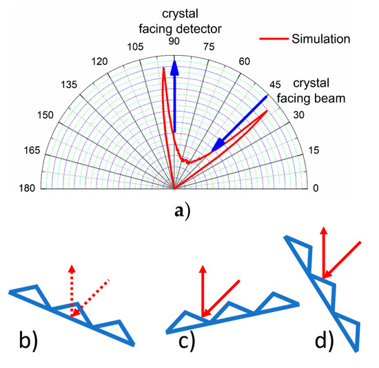 (a) Simulated signal intensity of a scattering simulation for Pt{110}-(1 × 2). Pictograms of the {110} crystal orientation at key specular positions: (b) pseudo-specular reflection from the surface plane ignoring microfacets; (c) specular reflection from first facet ~102°; and (d) specular reflection from second facet at ~33°.