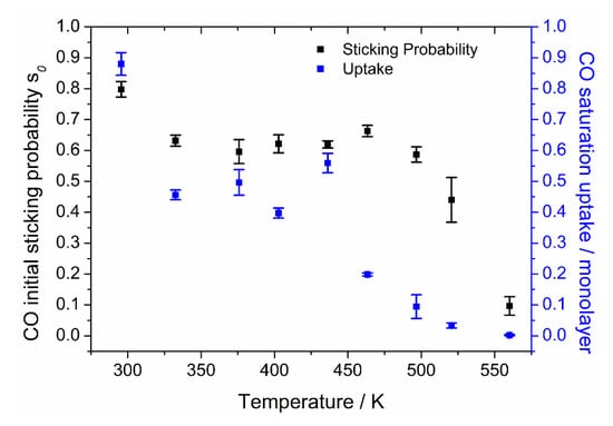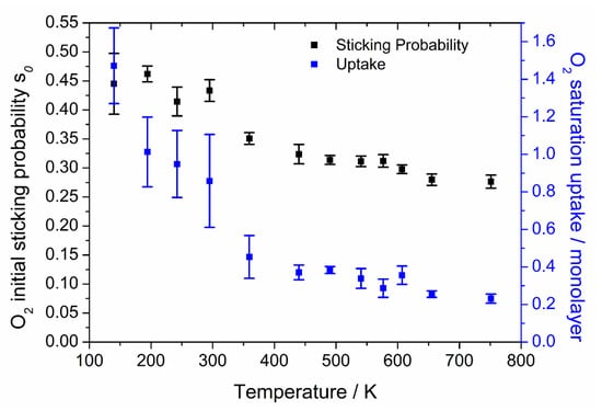 The high uptake at low temperatures, and big decrease up to 350 K, coincides with a low-temperature oxygen desorption peak found by Wilf and Dawson at a temperature of 250 K that extends to 350 K [12]. A similar observation was made by Walker et al. [13], although they also found a very sharp peak at approximately 220 K. They attributed this peak to the presence of molecularly chemisorbed oxygen O2. Sticking probability versus uptake curves at several temperatures are given in the Supplementary Materials (Figure S3).