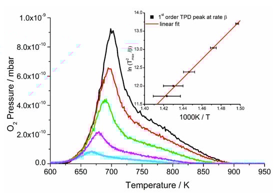 Desorption traces for oxygen TPD as a function of heating rate and coverage are shown in Figure 4 and Figure 5, respectively. For heating rate dependent TPD (Figure 4), the crystal was dosed with 22.5 L (3 × 10−5 mbar.s) of oxygen at 420 K.