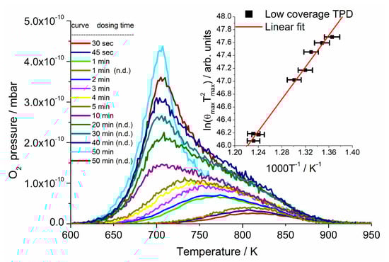 where ν1 is the preexponential factor of desorption, Ed is the desorption energy and R is the molar gas constant. Using this approach, we calculated a desorption energy of Ed = 218.6 ± 5.7 kJ/mol and a preexponential factor of ν1 = 3.6 × 1015±0.4 s−1. These values are high in comparison to literature. Wilf and Dawson found a desorption energy for the β1 state of 134 kJ/mol, with a preexponential factor of 1.7 × 109 s−1 [12], while Walker et al. measured the adsorption heat of O2 using microcalorimetry [13] and found a value of 170 kJ/mol for the β1 oxygen state. They also calculated the desorption energy using the Redhead formula [36] (Equation (2)):