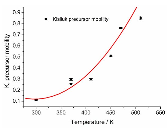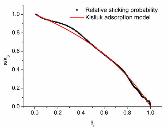 The sticking probability curves of CO (an example is shown in Figure 8) show precursor-mediated adsorption behavior [11]. CO is trapped into a weakly held mobile precursor state, which can be described as a two-dimensional gas [39]. This mobility gives the possibility of finding sites for adsorption on the surface even if the arrival site is blocked. Some of our sticking curves have been fitted by the Kisliuk expression [41], Equation (4).
