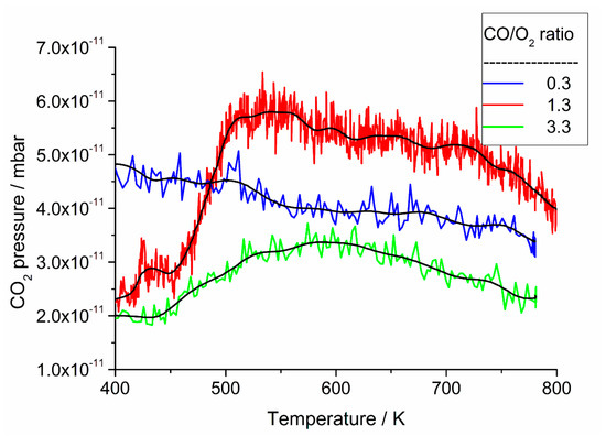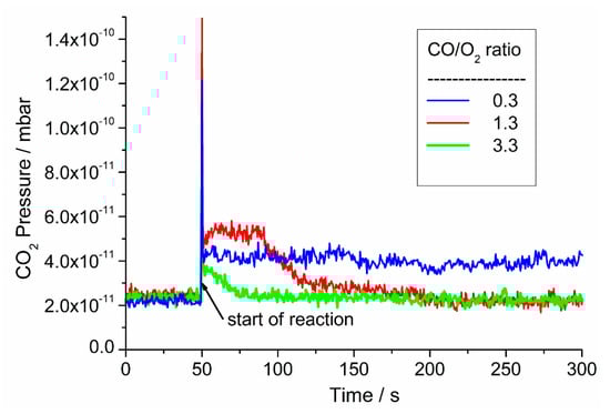 Steady-state Temperature Programmed Reaction (TPR) experiments were carried out with different CO/O2 ratios in the beam. Initially, when introduced to the clean surface at 373 K, the mixed beam produces CO2 until the surface is covered with CO (Figure 10). With a high CO/O2 ratio, the CO2 evolution stops quickly (after ~25 s of reaction) due to surface poisoning with CO, whereas at a low ratio it seems to reach near steady-state CO2 evolution.