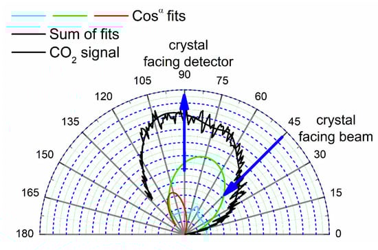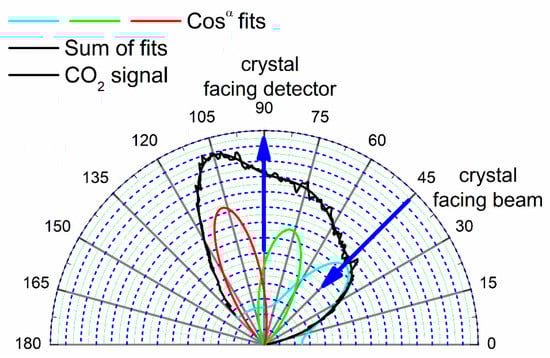 The resulting curves showed a broad distribution over the measured angular range, but, for temperatures above 470 K, three components are clearly visible. The curves were deconvoluted into cosine power functions using a numerical least-square fit (Simplex and Levenberg–Marquardt algorithms) to the function given in Equation (5).