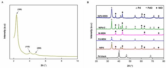 Small-angle (A) X-ray diffraction (XRD) patterns of MSN and wide-angle, (B) XRD patterns of Pd black, NiPd, Pd–MSN, Ni–MSN, NiPd–C, and NiPd–MSN electrocatalysts.