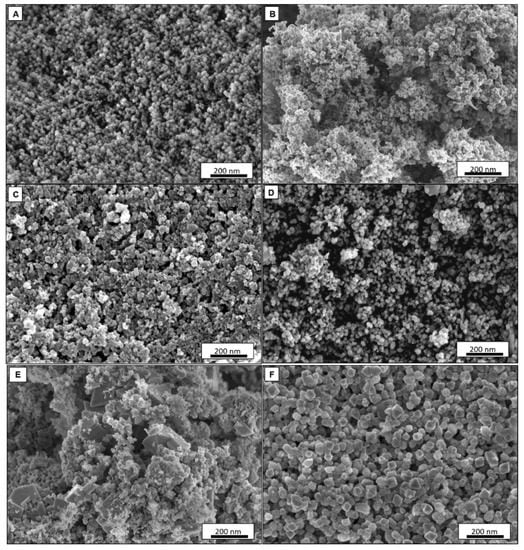 Field emission scanning electron microscopy (FESEM) images of (A) MSN, (B) Pd black, (C) Pd–MSN, (D) Ni–MSN, (E) NiPd–C, and (F) NiPd–MSN electrocatalysts with a magnification 30,000 KX.