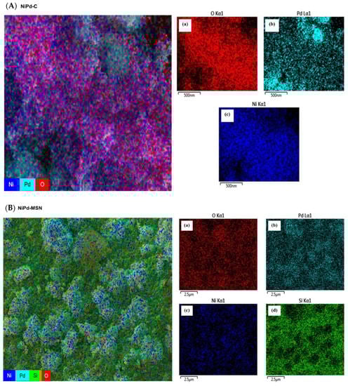 Figure 2A–F displays micrographs with the magnification of 30 kX for electrocatalysts of MSN, Pd black, Pd–MSN, Ni–MSN, NiPd–C, and NiPd–MSN, respectively. It can be seen that the spherical shape of the MSN was sustained with Ni, Pd, and NiPd loaded onto MSNs and the metal particles filled up some of the pores and were well-dispersed on the support of MSN powder. However, when the Ni, Pd, and NiPd were added, the shape of MSN was slightly reduced and less aggregated [21]. The bigger pore diameter of NiPd–MSN can be observed compared to bare MSN (Supplementary MaterialsFigure S1). The isomorphous substitution of nickel and palladium atoms into the silica frameworks may explain such great differences between nickel-containing and non-nickel samples. This contributes to a large contraction of the walls and, as a result, the expansion of the pores [23]. Figure 2E is the NiPd catalyst deposited on the carbon black, NiPd–C; the FESEM image spotted several agglomerations of Ni and Pd nanoparticles. The dispersion of Ni and Pd nanoparticles can be seen through the mapping shown in Figure 3: (a) Ni and (b) Pd for both (A) NiPd–C and (B) NiPd–MSN electrocatalysts. From the mapping images of the NiPd–C electrocatalyst, both metals were evenly dispersed on the carbon black; but several agglomerations occurred for Pd. Additionally, from Figure 2E,F, it can be seen that both figures have different morphology, which in (E) is shown as the support. As mentioned in the XRD result (Figure 1A), MSN had a hexagonal structure. The NiPd–MSN electrocatalyst displayed the significant dispersion of NiPd metal on the surface of MSN, in agreement with the TEM image of the NiPd loaded catalyst, as shown in Figure 4. The presence of well-resolved pores of MSN can be seen in the TEM image. Additionally, the nanoparticle catalyst that constituted of almost spherical dark spots was well distributed in the MSN support with very little agglomeration, which demonstrates that MSN indeed has a vital role in inhibiting the agglomeration of nanoparticles. This kind of improvement of the NiPd dispersion onto a silica-based support has been observed by Damyanova et al. [25].