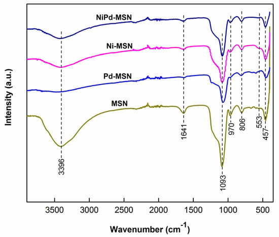 To confirm the structural changes of composites, FTIR analysis of all catalysts with MSN as the support material was carried out and the outcomes are shown in Figure 5. All catalysts with MSN as support materials displayed similar FTIR spectra with typical patterns of MSN, consisting of bands at 457, 806, 970, 1093, 1641, and 3396 cm−1. From the IR peaks at the bands ascribed was Si–O–Si (457 cm−1), Si–O–Si symmetric stretching (806 cm−1), external Si–OH groups (970 cm−1), Si–O–Si asymmetric stretching (1093 cm−1), water molecules retained by siliceous materials (1641 cm−1), and –OH stretching (3393 cm−1, broad) [26,27,28]. The relative intensity of the IR bands for transmittance was different, possibly due to the different morphology of all catalyst composites [23].