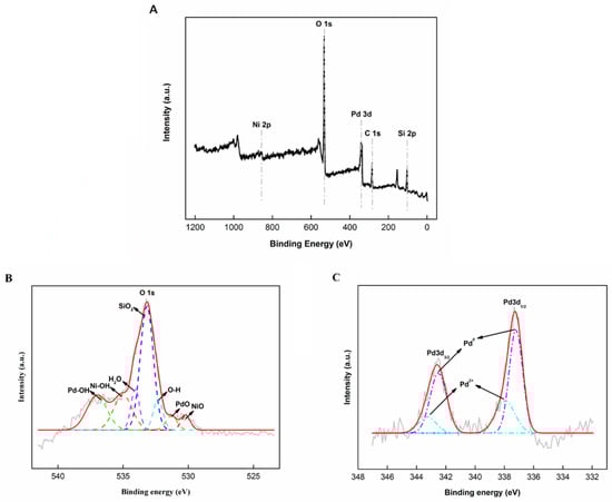 X-ray photoelectron spectroscopy (XPS) was utilized to identify the chemical state, elemental composition, and elemental electronic state that exists within a material. Figure 7A shows a wide XPS scan from NiPd–MSN, which demonstrated the Pd, Ni, O, and Si peaks. These results correlated well with the energy dispersive X-ray (EDX) measurements. The elemental composition was divided into 3.8% Pd, 3.5% Ni, 61.0% O, and 31.7% Si. During the preparation process, the ratio of Ni to Pd used was 1.5:1. However, the actual ratio observed in XPS was 1:1. The content of the O element was 61.0%, which was abundant in the NiPd–MSN catalyst. The O 1s spectrum was deconvoluted into four peaks with the binding energy of 530.1, 531.2, 532.2, 533.1, 534.1, 535.0, and 537.0 eV, corresponding to the NiO, PdO, O–H, SiO2, H2O, Ni–OH, and Pd–OH, respectively (Figure 7B) [31,32,33,34,35].