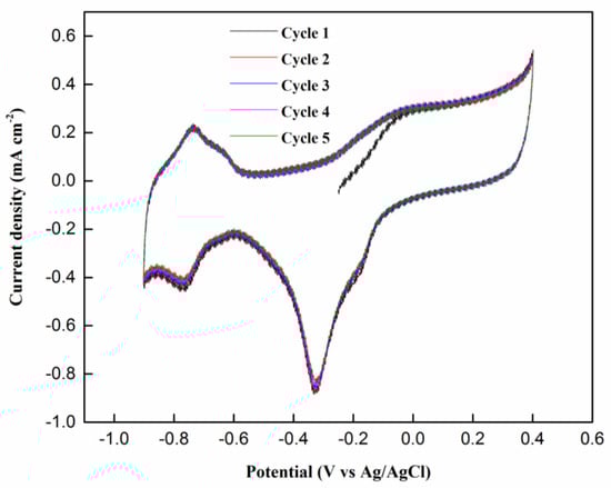 Figure 9 shows the repeated five cycles of CV profiles for the NiPd–MSN electrocatalyst in 1.0 M NaOH. This experiment was carried out to confirm that the PdO was reduced to Pd after five cycles during the reaction. The anodic reactions at region −0.2 to 0.4 V in the forward scan were linked with the formation of the PdO layer on the catalyst surface [48,49,50]. Equations (2) and (3) can be described as the corresponding reactions [48]: