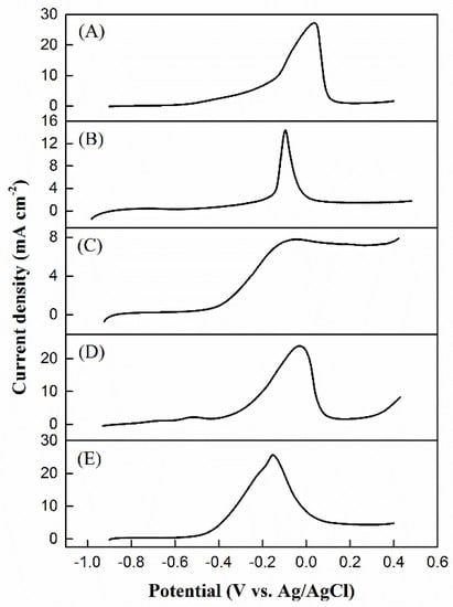 The cyclic voltammograms (Figure 6A) demonstrate the behavior of the Pd black, Pd–MSN, Ni–MSN, NiPd–C, and NiPd–MSN electrocatalysts at a scan rate of 50 mV s−1 in the potential range from −1.0 V and 0.6 V vs. Ag/AgCl. On the anodic sweep for NiPd–MSN and NiPd–C, it is feasible to detect two main electrodic techniques: hydrogen adsorption (from −0.85 V to −0.75 V vs. Ag/AgCl), and adsorbed hydrogen oxidation of Pd to PdO, while the possible potential region of Pd oxidizing to PdO remains unclear in alkaline conditions [18]. Nevertheless, the formation of PdO has suggested forms at more positive potentials. In the cathodic sweep, it is feasible to notice the reduction of PdO to Pd peak (around −0.4 to −0.2 V vs. Ag/AgCl) for NiPd–MSN, while the reduction of PdO to the Pd peak (around −0.5 to −0.4 V vs. Ag/AgCl) for NiPd–C. Even though it had similar voltametric profiles, there were subtle differences in each voltammogram for methanol electrooxidation and adsorption in essential regions. The NiPd–MSN electrocatalyst shifted to a more positive potential compared to the NiPd–C electrocatalyst, which attributed to the synergy between Ni and Pd nanoparticles. Additionally, it indicates that the incorporation of Ni in Pd inhibits the chemisorption of OH on the Pd sites [16]. Due to the hydrogen penetration into all electrocatalysts, the electrochemical active surface areas (ECSAs) of all the samples was determined by the charge of the PdO to Pd reduction region and are tabulated in Table 2. An electrocatalyst’s catalytic activity is known to be dependent on their ECSA. The ECSA for all the samples was determined via the following equation: