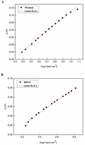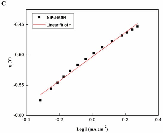 The measurements of linear sweeping voltammetry were performed as demonstrated in Figure 11 to identify the onset potential of methanol electrooxidation on the catalysts, as listed in Table 2. The methanol electrooxidation onset potential on the NiPd–MSN electrocatalyst was lower than that of the other investigated catalysts, suggesting that MSN can practically reduce the overpotential in methanol electrooxidation reaction. This result demonstrates that NiPd–MSN is easier for the methanol electrooxidation reaction that would take place on it compared with other electrocatalysts, as described in the literature where the lower onset potential is associated with the C–H bonds breaking and following the removal of intermediates by oxidation with OHads [52,53]. Additionally, to introduce a Tafel plot, the LSV data were derived, where the reaction rate of the electrochemical was correlated with the overpotential.