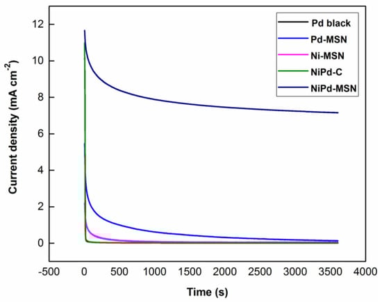 Figure 13 displays the chronoamperometry curves for methanol oxidation with Pd black, Pd–MSN, Ni–MSN, NiPd–C, and NiPd–MSN electrocatalysts achieved at room temperature using 1.0 M methanol in 1.0 M NaOH with a constant potential of −0.20 V vs. Ag/AgCl for 3600 s. The tolerance to poisoning by intermediate species, activity, and stability toward MOR of the prepared electrocatalysts can be determined through this test. In all tests, the peak current attained a stable form and the stability of the electrocatalyst could be determined. It is worth noting that NiPd–MSN electrocatalysts have a greater mass activity toward methanol electrooxidation, in comparison to other electrocatalysts, despite displaying a rapid current decay at the initial period, possibly resulting from the formation of intermediates and CO-like species adsorption on the Pd or because of the deactivation of their catalytic sites [18,36]. It can be observed that the limiting current of the NiPd–MSN over the entire period was higher than other electrocatalysts, indicating improved stability. The NiPd–MSN electrocatalysts retained 61% of its maximum current generated which the highest compared with Pd black (48% retention), Pd–MSN (31% retention), Ni–MSN (8% retention), and NiPd–C (53% retention). Thereby, it is implied that the synergistic effects from adding Ni to Pd are in charge of the lower poisoning rate [58]. Furthermore, it demonstrates that MSN as the support was an improved replacement for carbon black support, where the mesoporous structure of MSN can enhance the overall surface area and active reaction site on the electrocatalyst surface area.