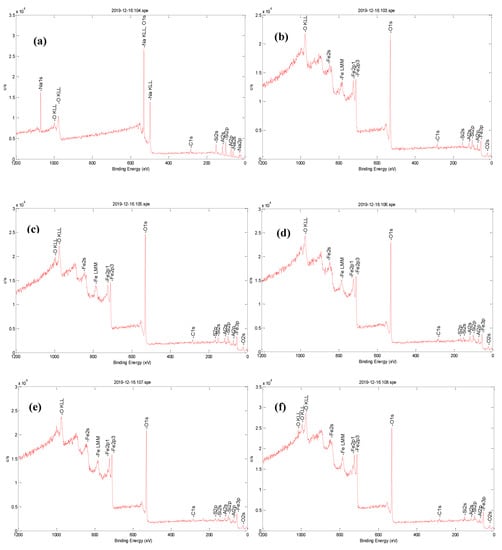 The elemental composition and the interaction between Fe3O4 and zeolite in FeZ composites were studied using XPS analysis in the region of 0–1200 eV, and the results are shown in Figure 2. Based on the survey spectra presented in Figure 2a, C, O, Na, Al, and Si are present on the surface of bare zeolite, while the survey spectra in Figure 2b–f confirmed the coexistence of C, O, Al, Si, and Fe in the FeZ composites.