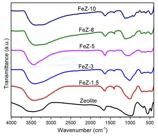 The functional groups present in bare zeolite and in FeZ composites were also studied using FTIR spectrometer, and the results are shown in Figure 3. In the case of bare zeolite, the absorption bands at 1020 and 440 cm−1 are due to Si–O–Si stretching and bending vibrations, respectively. Meanwhile, the absorption band at 532 cm−1 is due to Al–O–Si deformation []. However, the intensities of the peaks at 440 and 532 cm−1 attributed to Si–O–Si and Al–O–Si decrease significantly due to the loading of zeolite with Fe3O4. The peaks at 3500 and 1650 cm−1 are due to the stretching and bending vibrations of hydroxyl groups of absorbed water molecules, respectively []. In the case of FeZ composites, the band at 583 cm−1 is attributed to the stretching vibration of Fe–O [], which confirmed the existence of Fe3O4 in FeZ composites []. The absence of such band in FeZ-1.5 and FeZ-3 composites might be attributed to the low amount of magnetite in the composites. Furthermore, the small peak at around 1450 cm−1 in the FeZ composites is due to the remnant of NH3 used during composites preparation [].