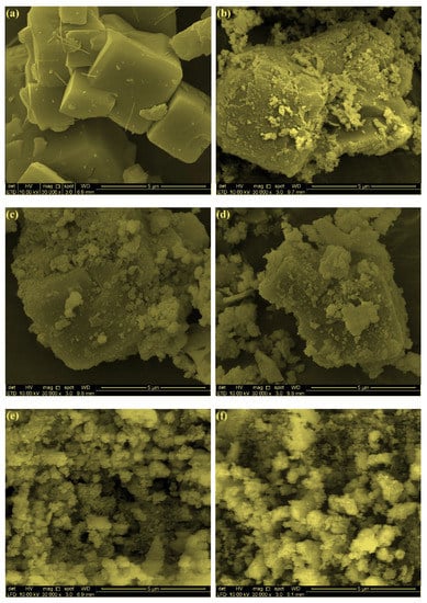 FESEM images of bare zeolite and FeZ composites are shown in Figure 4. Based on the image presented in Figure 4a, bare zeolite is made up of various sized particles with an irregular shape, and the surface is virtually smooth. However, in the case of FeZ composites in Figure 4b–f, the surface is rough, and this could be due to the presence of Fe3O4 particles in the form of clusters or nanoparticles on the surface of the zeolite. Among the FeZ composites, the zeolite matrix is still clearly observable in the case of FeZ-1.5, FeZ-3, and FeZ-5 composites, which contain a low amount of Fe3O4 loading during synthesis. However, at a higher amount of Fe3O4, such as FeZ-8 and FeZ-10 composites, the presence of zeolite matrix cannot be detected.