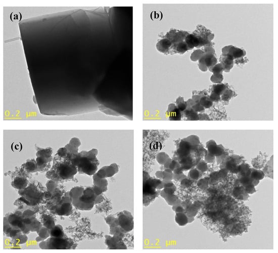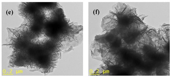 The morphology of pristine zeolite and FeZ composites was further studied using TEM, and the results are shown in Figure 5. Based on the image presented in Figure 5a, pristine zeolite is composed of irregularly shaped particles with a smooth surface. In the case of FeZ composites shown in Figure 5b–f, some new particles apart from that of pristine zeolite were observed in the composites. The amount of the particles increases with the increase in the amount of Fe3O4 nanoparticles being immobilized onto zeolite. The change in morphology to hair-like particles was observed at higher magnetite concentration. In general, despite subjecting the FeZ composites to strong ultrasonication treatment during TEM sample preparation, the Fe3O4 nanoparticles could still be found on the zeolite surface. This indicates a strong interaction between Fe3O4 nanoparticles and zeolite.