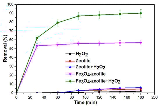 Initially, a series of control experiments were conducted to determine the performance of (i) raw zeolite + OFL, (ii) H2O2 + OFL, (iii) Fe3O4-zeolite + OFL, (iv) zeolite + H2O2, and (v) Fe3O4-zeolite + H2O2 + OFL towards the removal of OFL. The Fe3O4-zeolite composite used for this study is FeZ-8, and the results are shown in Figure 6.