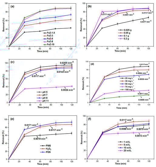 The effect of different oxidants—peroxydisulfate (PDS), hydrogen peroxide (H2O2), and peroxomonosulfate (PMS)—on the catalytic degradation of OFL was also studied. This study was conducted by activating PDS, PMS, and H2O2 with FeZ-8 to produce  and HO•. Based on the results shown in Figure 7e, the order of reactivity is PDS > H2O2 > PMS. The reaction of Fe2+ with PS, H2O2, and PMS could be presented in Equations (1)–(3) [].