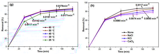 Effects of (a) Fe3O4 loading on zeolite, (b) FeZ-8 catalyst dosage, (c) initial solution pH, (d) initial OFL concentration, (e) different oxidants, (f) H2O2 dosage, (g) reaction temperature, and (h) inorganic ions on the Fenton degradation of OFL. Unless stated otherwise, reaction conditions are based on: [OFL] = 20 mg·L−1, pH = 9, (FeZ-8) = 1 g·L−1, (H2O2) = 5 mL·L−1.
