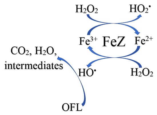 The reaction pathway for OFL degradation using the FeZ composite as a hetero-Fenton catalyst has been proposed and is schematically shown in Figure 9. The first stage involves the in-dark adsorption of OFL onto the surface of the FeZ composite catalyst. The Fe3O4 in FeZ is composed of Fe2+ and Fe3+. The Fe2+ ions react with H2O2 to form HO• and more Fe3+ (Equation (5)). The HO• is responsible for the degradation of OFL into CO2, H2O, and other intermediates. However, the H2O2 further reduces the Fe3+ back to Fe2+ (Equation (7)) and the cycle continues.