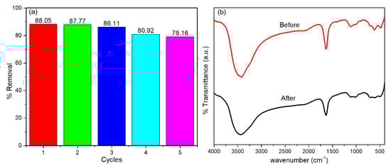 A reusability study was conducted to investigate the stability of the FeZ-8 catalyst during repeated cycles. As shown in Figure 10a, the performance of the FeZ-8 catalyst after the fifth cycle remained significant, as the marginal drop in the efficiency is still below 10%, an indication that the FeZ-8 catalyst is reusable. The stability of the FeZ-8 catalyst was confirmed by examining the FTIR spectra of the catalyst before and after five cycles of repeated Fenton degradation studies, and no obvious difference exists between the two FTIR spectra of the FeZ-8 catalyst.