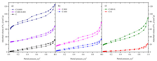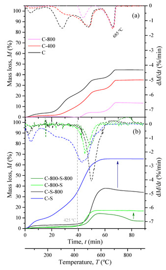 The content of sulfur has a higher value in the samples treated with H2SO4 without further thermal treatment (6.8% and 8.2% for C-S and C-800-S, respectively), likely due to the formation of surface sulfur groups, as observed in carbonaceous materials [20]. However, these functional groups are desorbed due to subsequent thermal treatment, as evidenced by the S values determined for C-S-800 and C-800-S-800 (0.8% and 0.6%, respectively).
