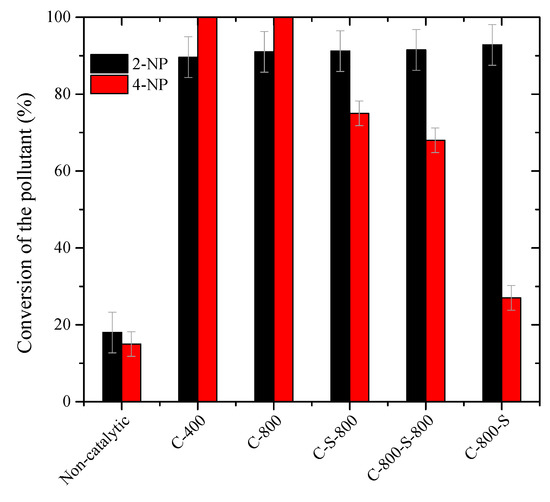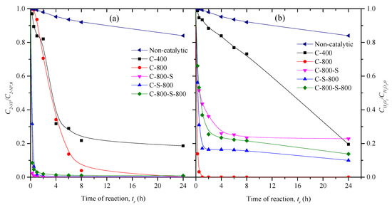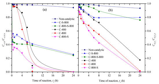 Regarding the catalysts treated with sulfuric acid (C-800-S, C-S-800, and C-800-S-800), these materials show higher 4-NP degradation rates at the beginning of the reaction (X4-NP = 44−67% after 30 min), likely due to its acidic character (Table 2). However, the conversions of 4-NP obtained with C-S-800 and C-800-S-800 after 24 h are lower (76%) when compared to the other catalysts. This can be ascribed to the low conversions of H2O2 during the CWPO runs with these materials (XH2O2 = 20%−24% after 24 h). The consumption of H2O2 was found to be higher (XH2O2 > 82% under the same operational conditions) than with the other catalysts (C-400, C-800, and C-800-S), meaning that the treatments conducted to prepare the materials led to the development of different catalytic activities in a competitive process that requires both the catalytic decomposition of H2O2 and the catalytic degradation of the organic pollutant [24,25]. In this sense, the higher basicity of the character of C-400 and C-800 plays a significant role in the global decomposition of H2O2 and the strong acidity of C-800-S in its efficiency [25].