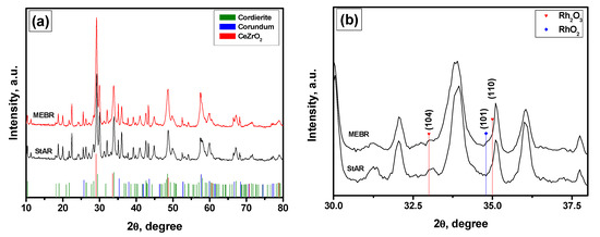 The two aged samples were characterized by X-ray diffraction analysis and X-ray photoelectron spectroscopy. The XRD patterns shown in Figure 4a do not reveal any changes in the phase composition of the samples aged in different modes. Both the patterns are mainly represented by the reflections of cordierite, corundum, and cerium-zirconium mixed oxide. The enlarged 2θ region of 30–38 ° presented in Figure 4b indicates that the reflections assigned to Rh2O3 phase [37] are less intensive in the case of MEBR sample, while the intensity of the possible reflection of RhO2 phase [38] slightly increases. It is worth to note that the XRD analysis of low rhodium content in such a complex composition is quite complicated.