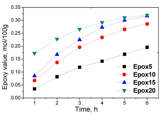 The oxirane rings content increased monotononically with the reaction time for all reactions. As expected, the efficiency of the reaction is greater when the catalyst concentration is higher. It was observed that after 6 h of the reaction the epoxy values of Epox15 and Epox20 are similar and it is not necessary to increase the catalyst concentration up to 20%. The increase in the intensity of the absorption band during the reaction, characteristic of epoxy groups depending on the catalyst concentration, is presented in Figure 2.