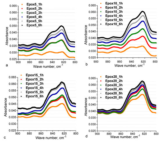 For Epox5, the peaks in the spectrum exhibit lower intensities compared to the corresponding Epox15 (Figure 2c) and Epox20 (Figure 2d) peaks. The absorbance band intensities correlate with the epoxy number values.