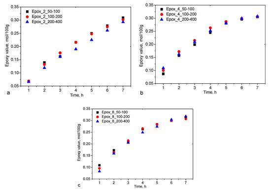 Based on our research it was found that in the case of Dowex resins containing 2% cross-linking agent the highest epoxy value was obtained for the resin with the largest grain size. In the case of resins containing 8% divinylbenzene, the opposite effect was observed. However, the differences in the epoxy numbers are insignificant. Therefore, the results obtained were compared with the epoxy oil (Epox_15) obtained through a reaction with Amberlite resin. This resin has a much lower price compared to Dowex resins. From the point of view of waste oil recycling, it is important to develop a low-cost process. The epoxy number of Epox_15 is slightly lower than the epoxy numbers obtained for the oils synthesized in the presence of Dowex resins containing 8% divinylbenzene, and comparable to resins with 4% cross-linking agent. Dinda et al. conducted epoxidation of cottonseed oil using two very different sizes of resin particles under otherwise similar conditions. The particle sizes were greater than 620 μm and smaller than 120 μm. They concluded that both particle sizes gave nearly the same oxirane conversion [18]. Goud et al. also analyzed the intraparticle diffusional limitations by using two widely differing particle sizes of resin, namely >599 and <64 μm under otherwise the same reaction conditions. They concluded that both particle sizes gave practically the same results [30].