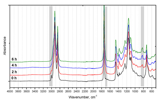 The analysis of FTIR spectra collected during the reaction allowed on-line detection of characteristic groups. In Figure 5, the FTIR spectra of the used cooking oil epoxidation with Dowex50X8 200-400 are shown. In the FTIR spectrum of the waste rapeseed oil, with wave numbers of about 3010 cm−1 and about 1650 cm−1, the bands corresponding to the vibrations of the double bonds between carbon atoms are visible. These signals lose their intensity as the epoxidation reaction progresses. Along with the decrease in the intensity of the bands corresponding to the vibrations of unsaturated bonds, the FTIR spectra of the epoxidized oil samples show signals in the range 800–850 cm−1, which are characteristic for epoxy groups.
