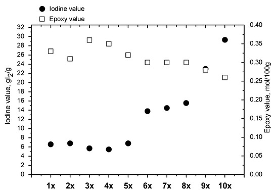 Temperature also has an important influence on the process of epoxidation of vegetable oils. According to the literature, as the reaction temperature increases, the time needed to achieve high efficiency decreases [24]. However, too high a temperature intensifies side reactions, mainly the opening of oxirane rings [24].